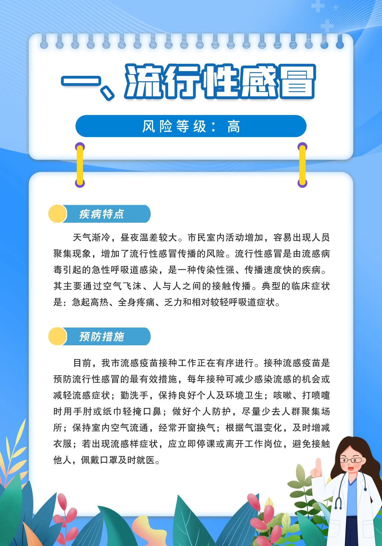 昆山市疾控中心发布十一月份疾病风险提示,十一月份本市进入了流行性感冒、诺如病毒感染性腹泻和水痘的高发季节,应予以防范,同时,应继续做好输入性蚊媒传染病和新冠病毒感染的防控工作。